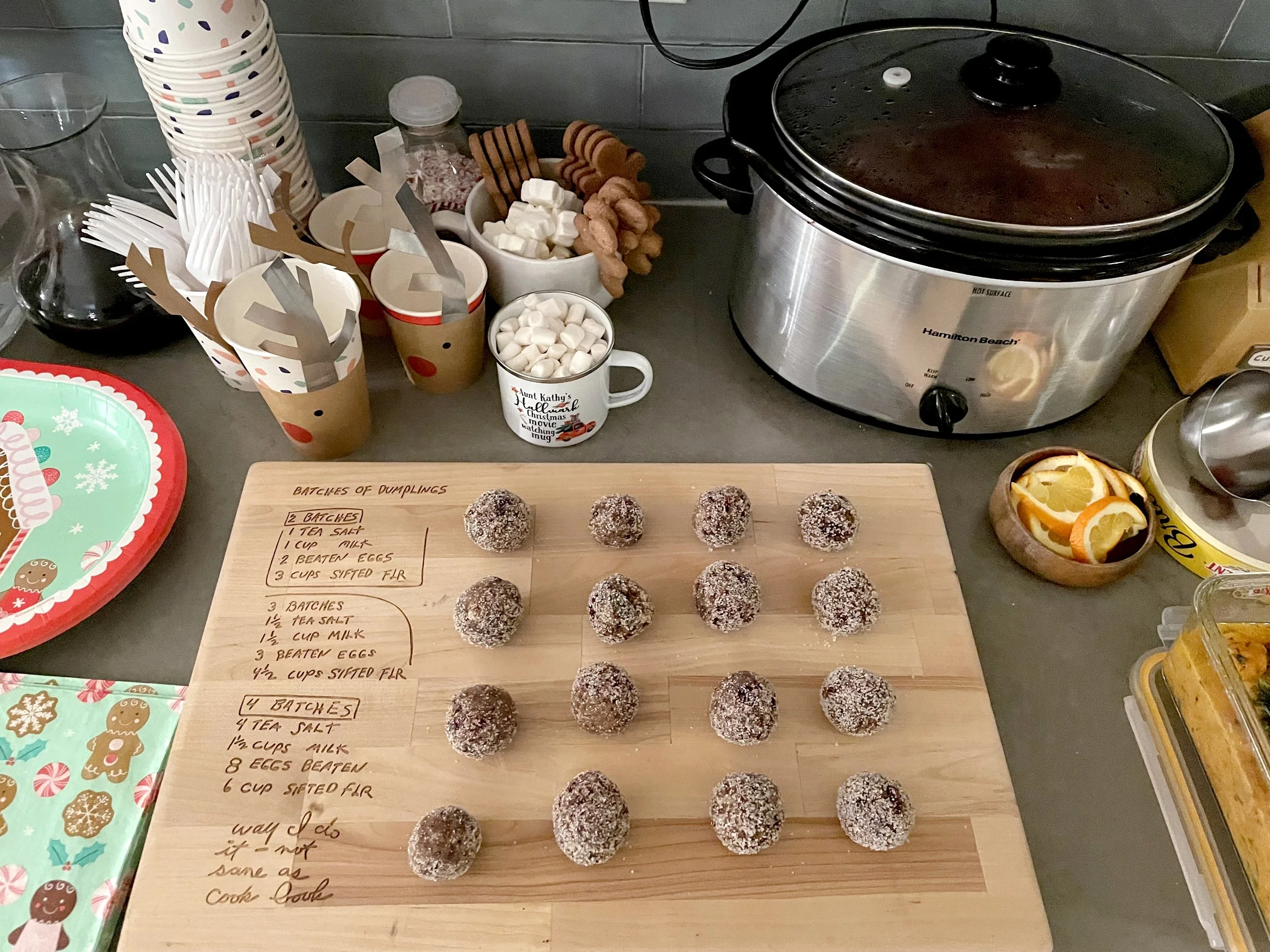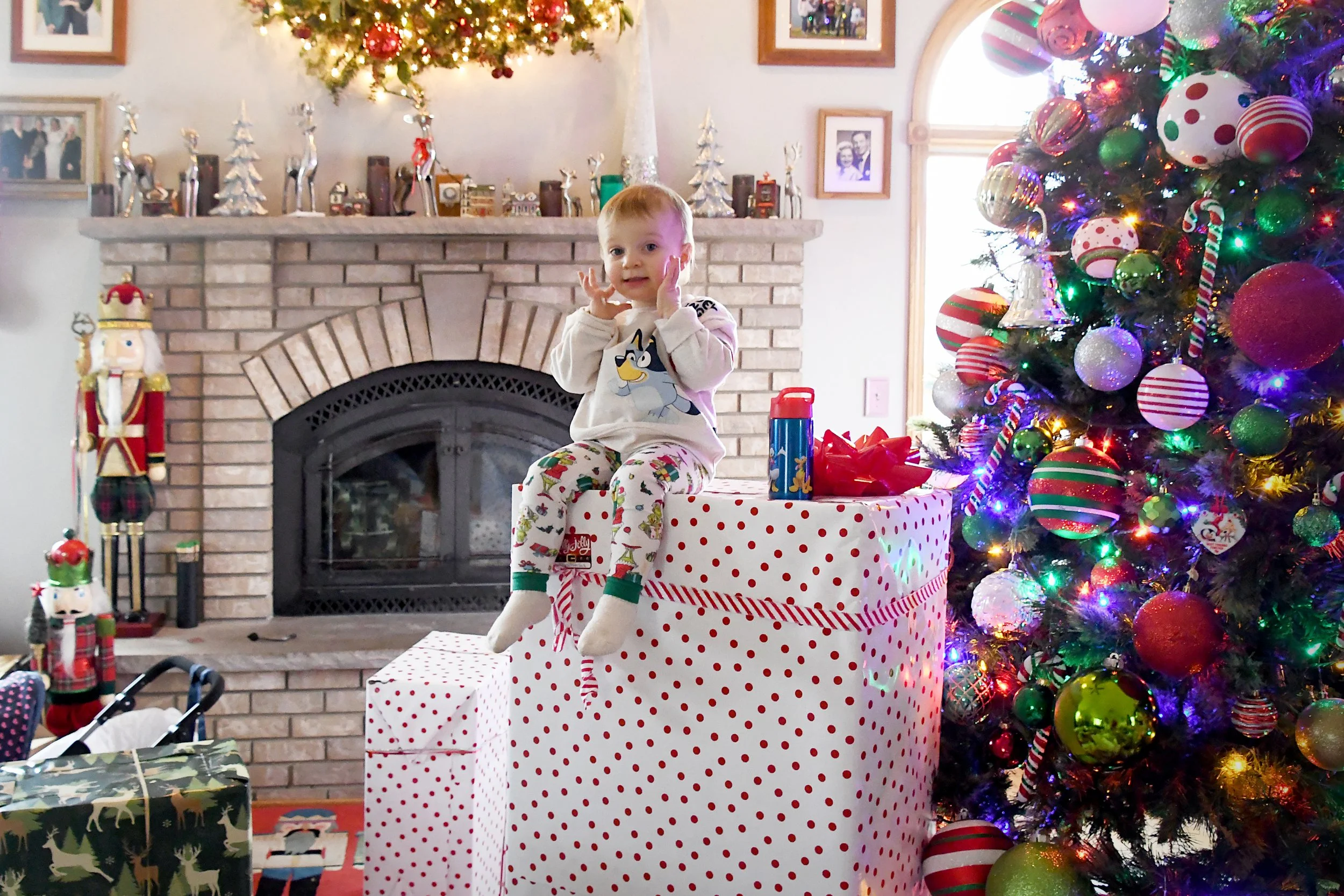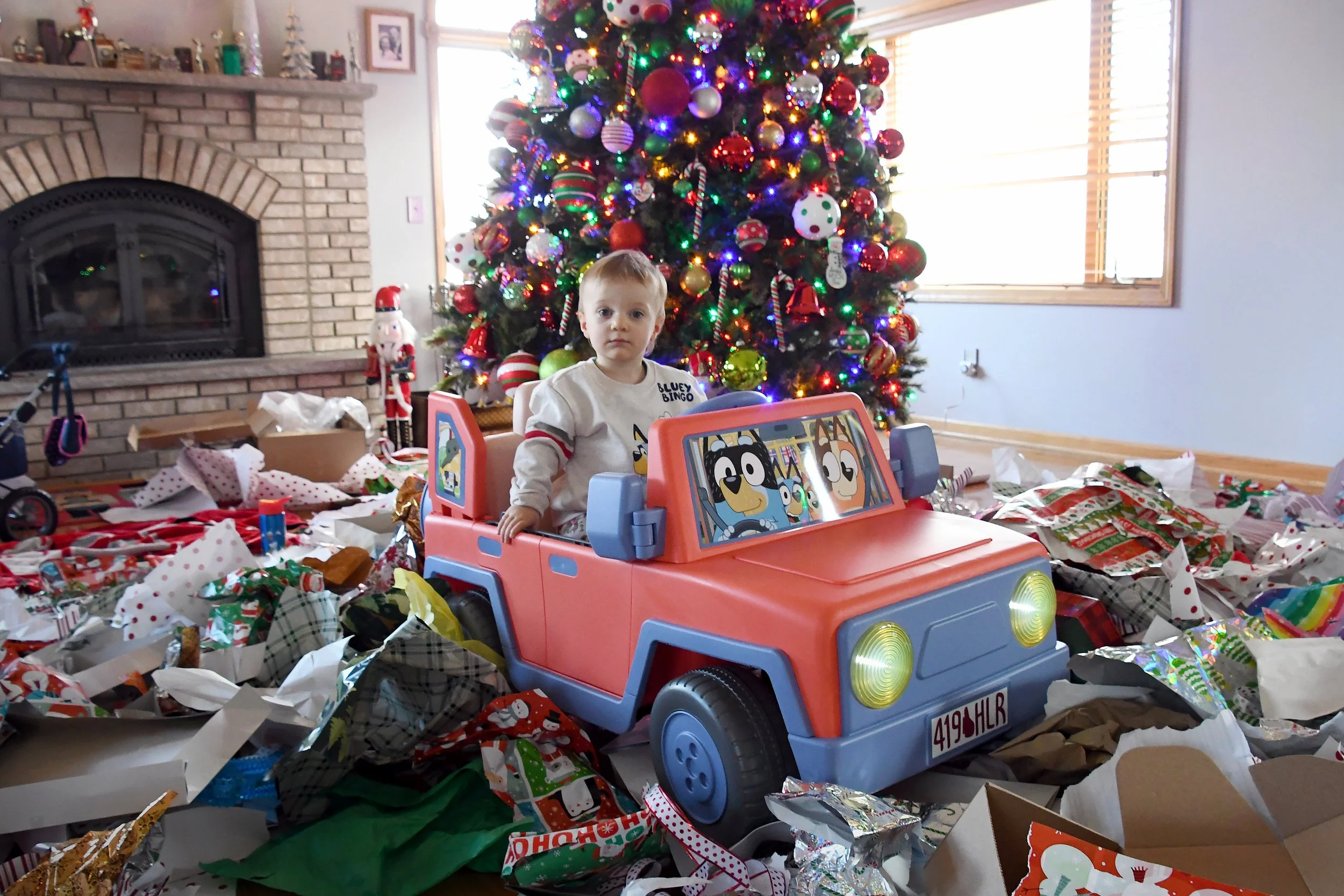 Christmas morning was perfect! We all woke up and jumped out of bed, around 6am, and Bronte was awake and ready for presents. Santa is now very real to her, and loved the wrapping paper and bows. As the morning went on and we unwrapped the gifts slowly, she gradually became more interested in hiding in the boxes and under paper. Grandma and Grandpa got her a Christmas house, which they decorated with lights, a baby stroller, a fast motorized Bluey car, and books galore. It was in this little Christmas cottage that Bronte would bring fake candles into, and we would pretend to heat up water and have tea parties. Jacque brought Mason and Brittany, and spent an afternoon making fake snow for Bronte to play with indoors.