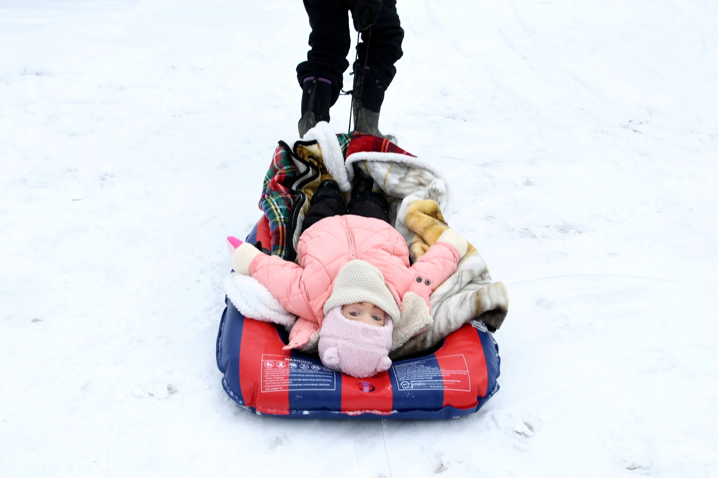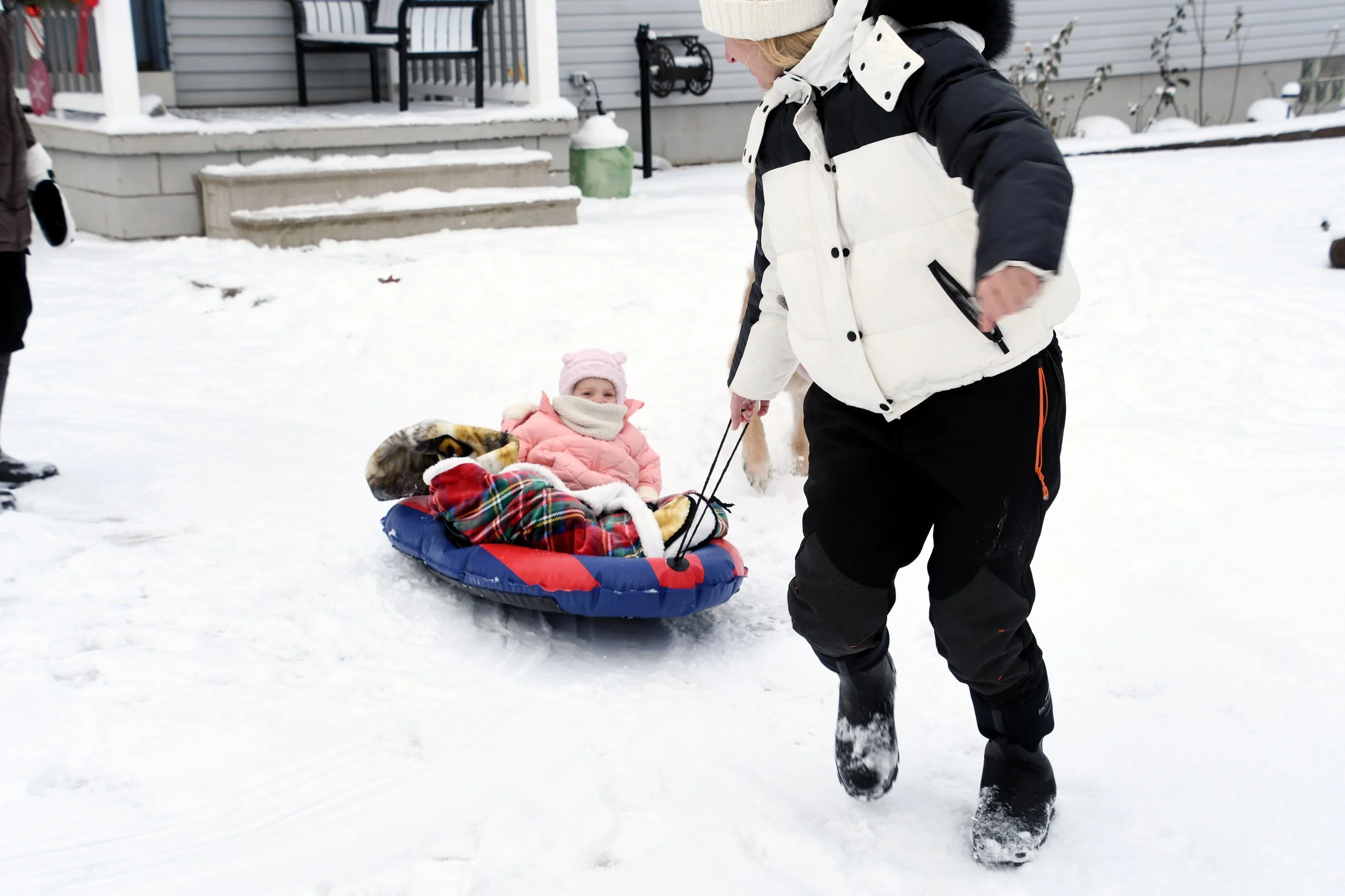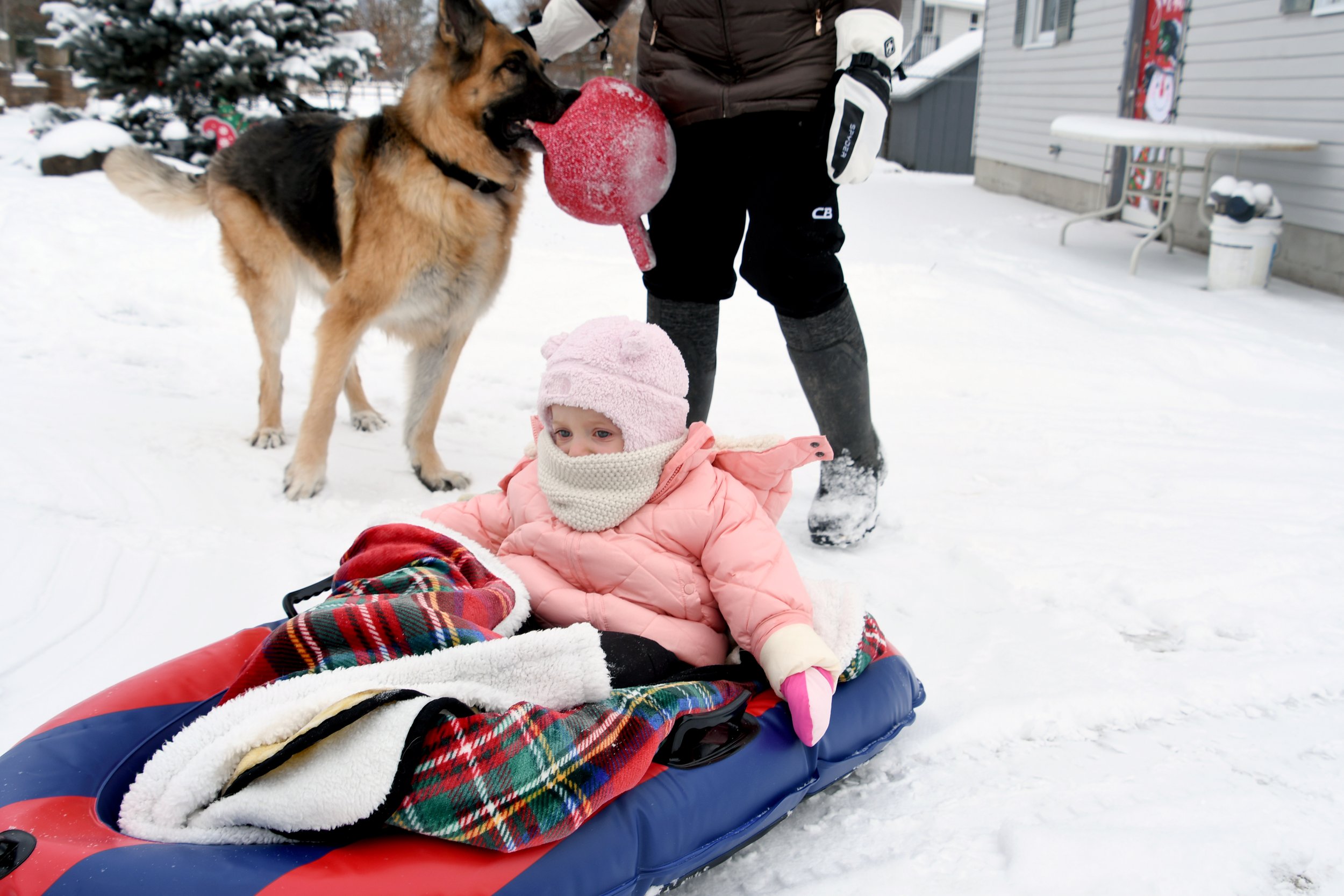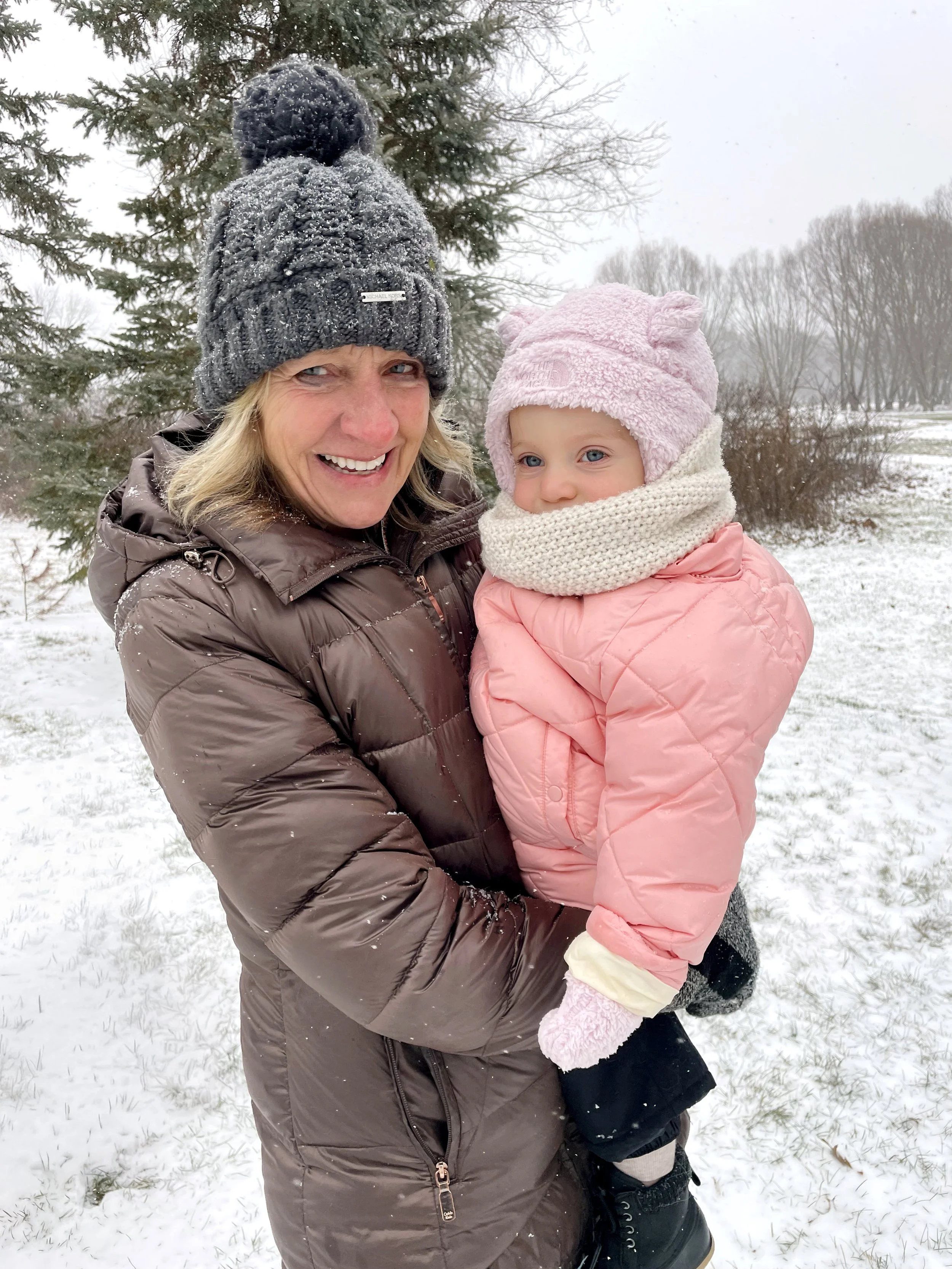 Spending time at Jamie’s house is always so special. Candles are thick and full of buttery scents, the fireplace is always on, and Hallmark reigns supreme. The kitchen is always overflowing with cookies, and there is Christmas music along with the smell of sausage rolls. The lights all around the property make us excited to go on evening walks, bundled up for the layer of snow that usually exists. This year Bronte loved watching Kai chase snowballs roll around looking for sticks. She took a tractor ride with Grandpa Perin, and went to see the neighbor’s cows with Grandma Jane. We successfully went sledding twice - once down a local hill with Jamie’s cousin Lilly, and it was silly to see how much air Bronte would get when her and Jamie hit a few bumps. Another time we connected the sled to the four wheeler, and zoomed around the property as the snow really began to fall.