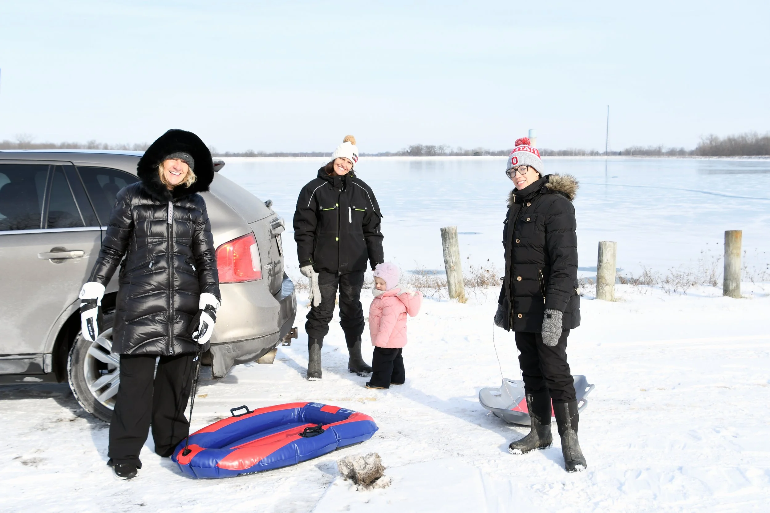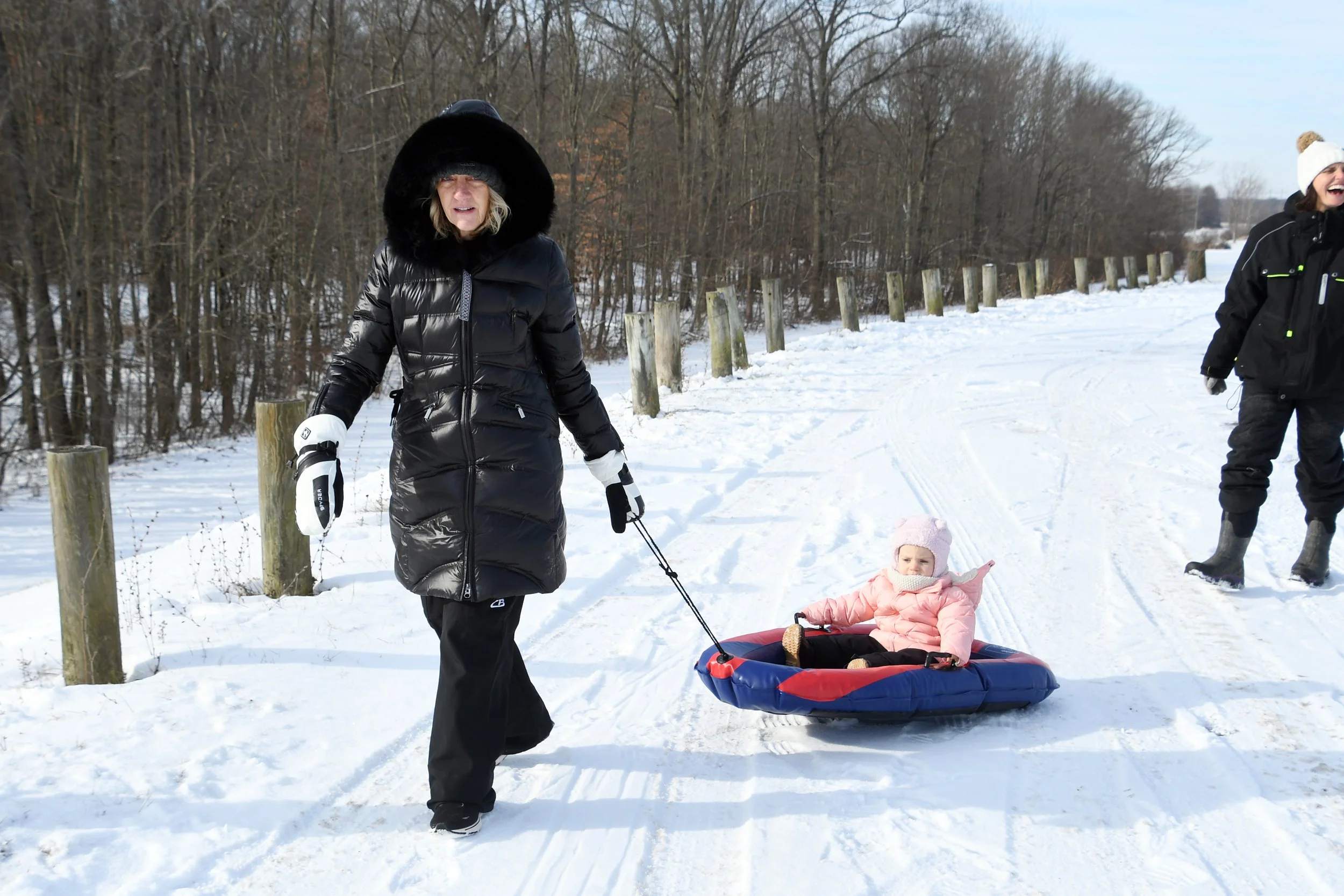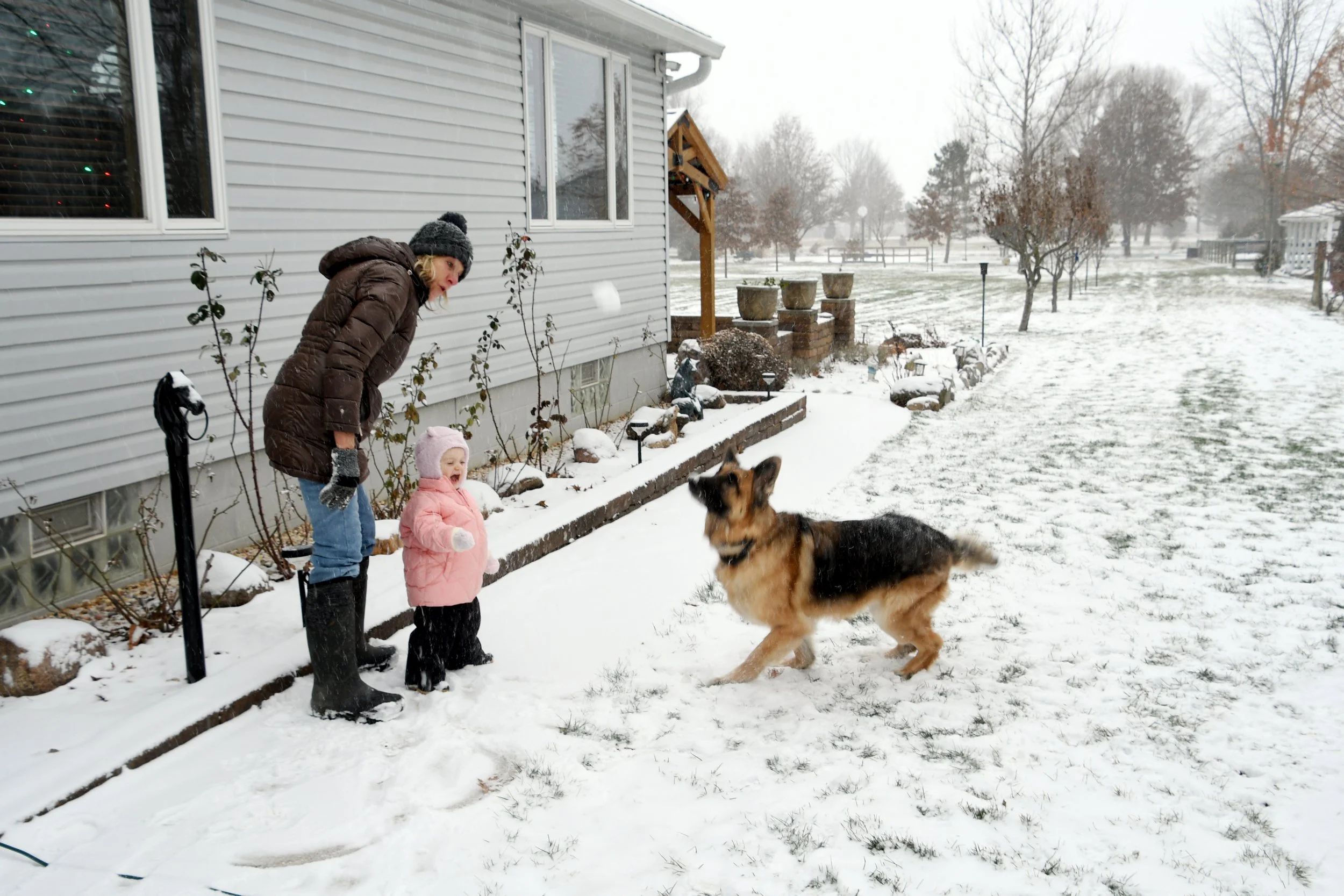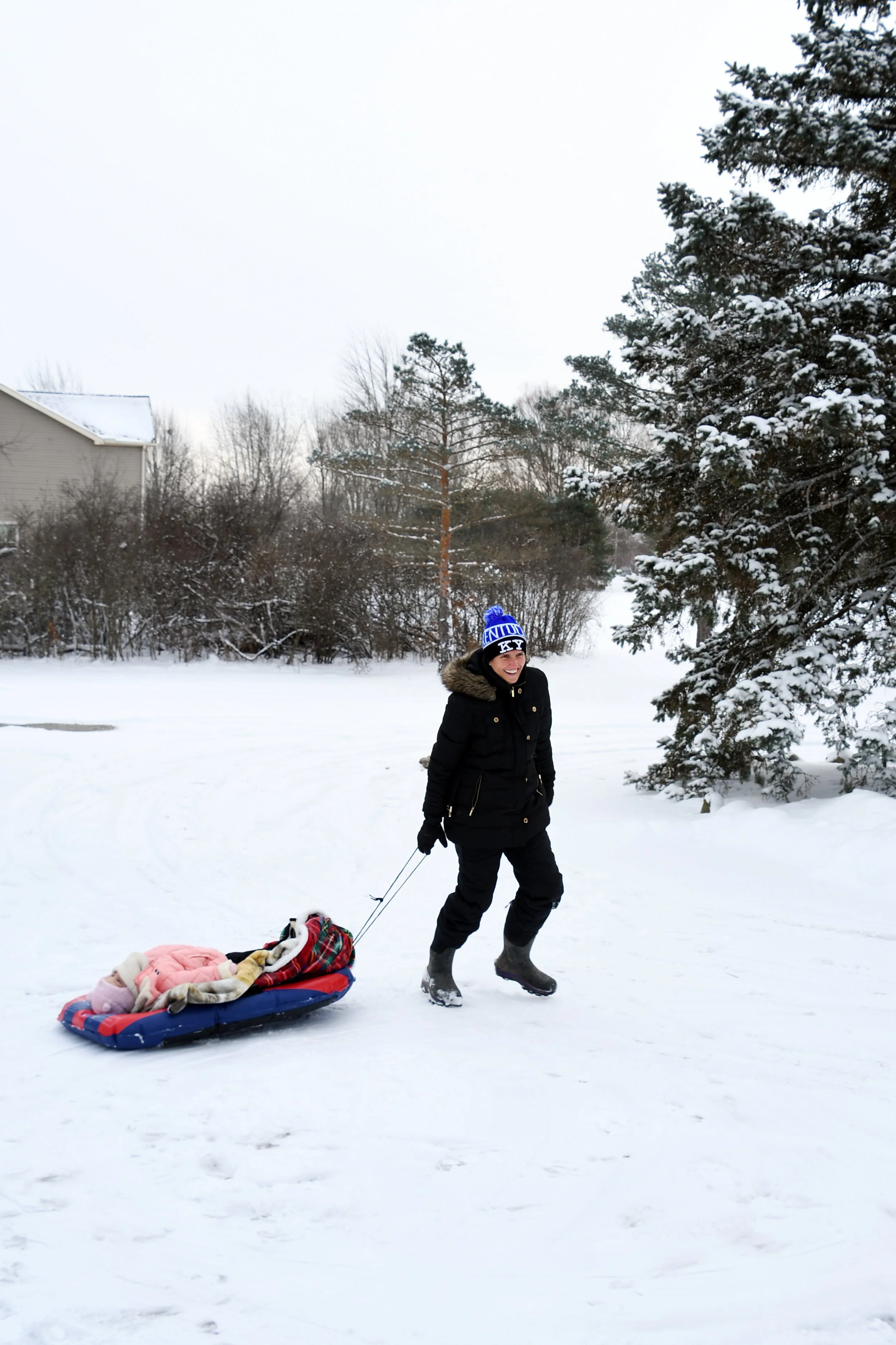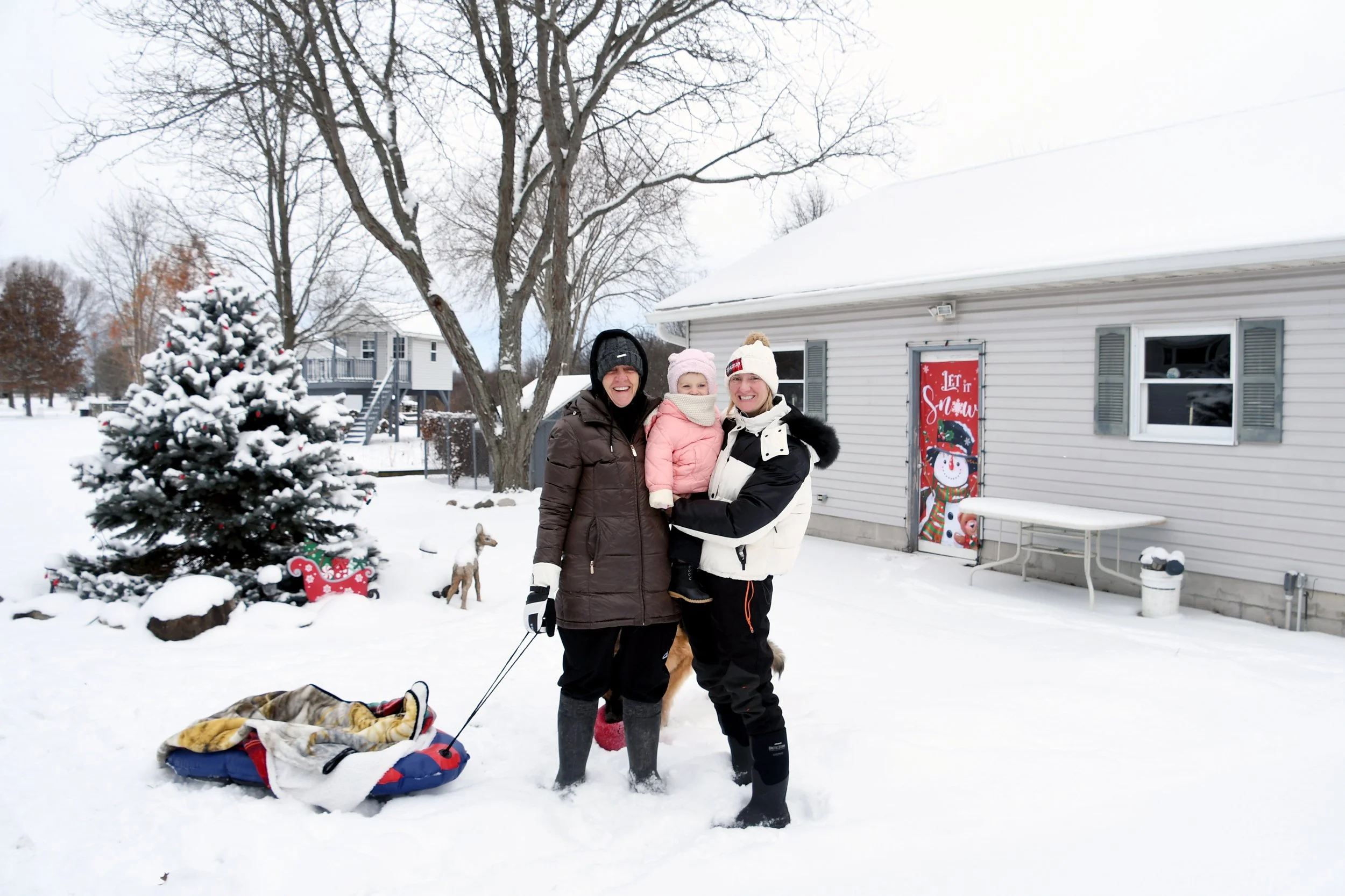 Spending time at Jamie’s house is always so special. Candles are thick and full of buttery scents, the fireplace is always on, and Hallmark reigns supreme. The kitchen is always overflowing with cookies, and there is Christmas music along with the smell of sausage rolls. The lights all around the property make us excited to go on evening walks, bundled up for the layer of snow that usually exists. This year Bronte loved watching Kai chase snowballs roll around looking for sticks. She took a tractor ride with Grandpa Perin, and went to see the neighbor’s cows with Grandma Jane. We successfully went sledding twice - once down a local hill with Jamie’s cousin Lilly, and it was silly to see how much air Bronte would get when her and Jamie hit a few bumps. Another time we connected the sled to the four wheeler, and zoomed around the property as the snow really began to fall.