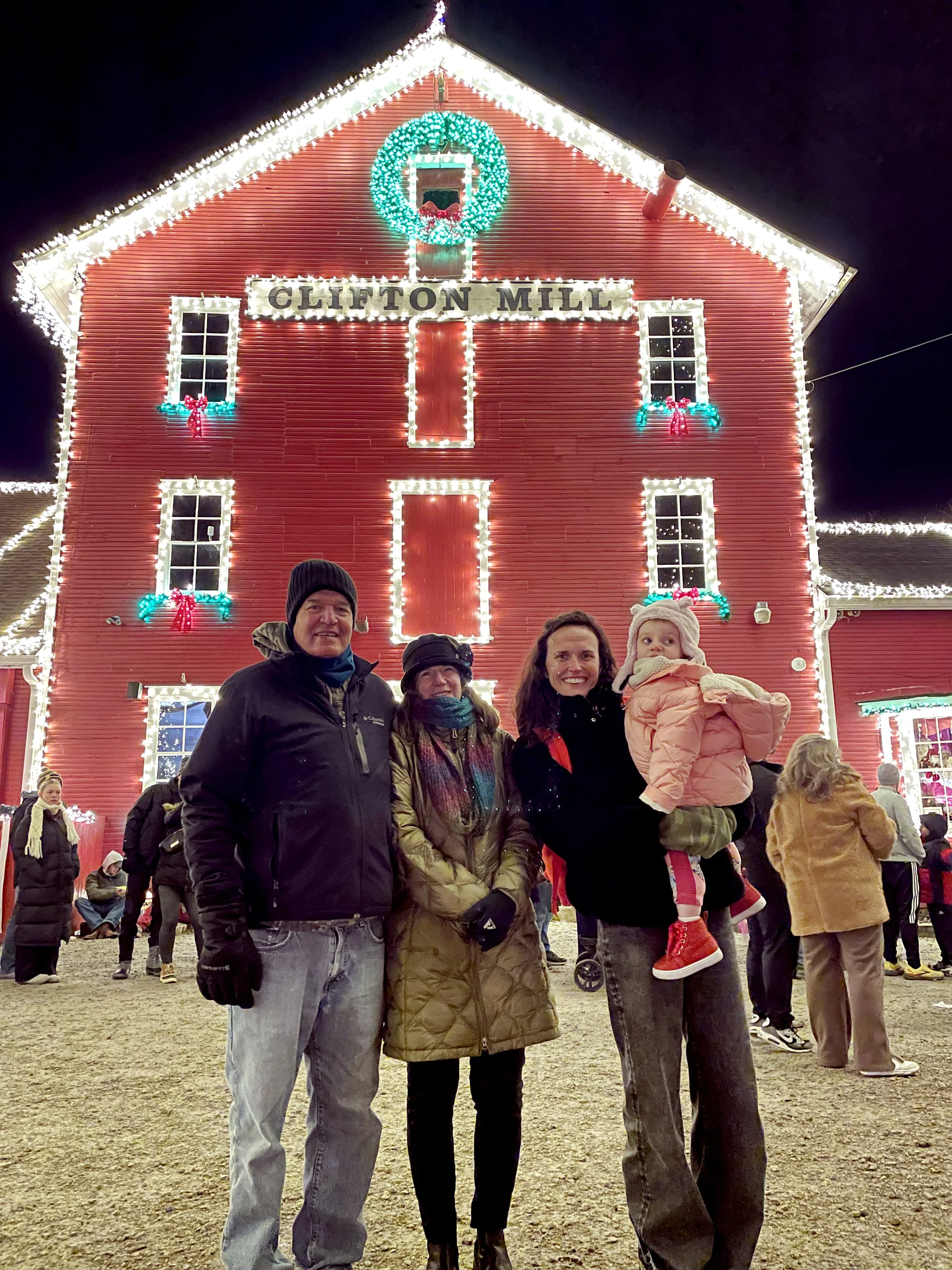 This year we got to go to Clifton Mill light show with Dad and Julia, and got to see Santa in his workshop. Many times he would single Bronte out, from his window or from where he perched on the chimney. Bronte was mesmerized by his moving reindeer, and in awe of seeing the bearded jolly St. Nick from her books. She knows Santa this year, and she knows he eats cookies and has lots of reindeer friends. Another evening we ate Oreos at the Danishek’s Chrismas party, followed by seeing lights at the Dayton Dragon’s Baseball stadium.