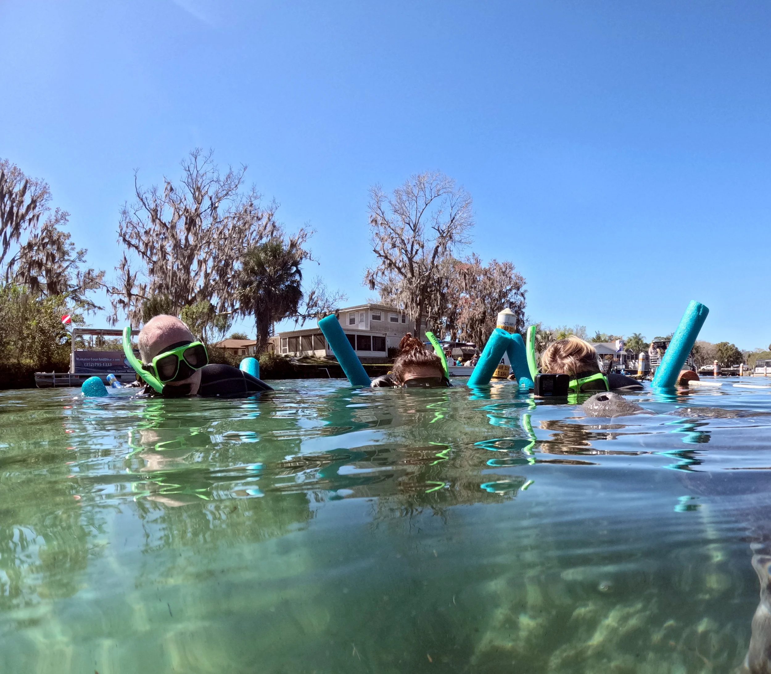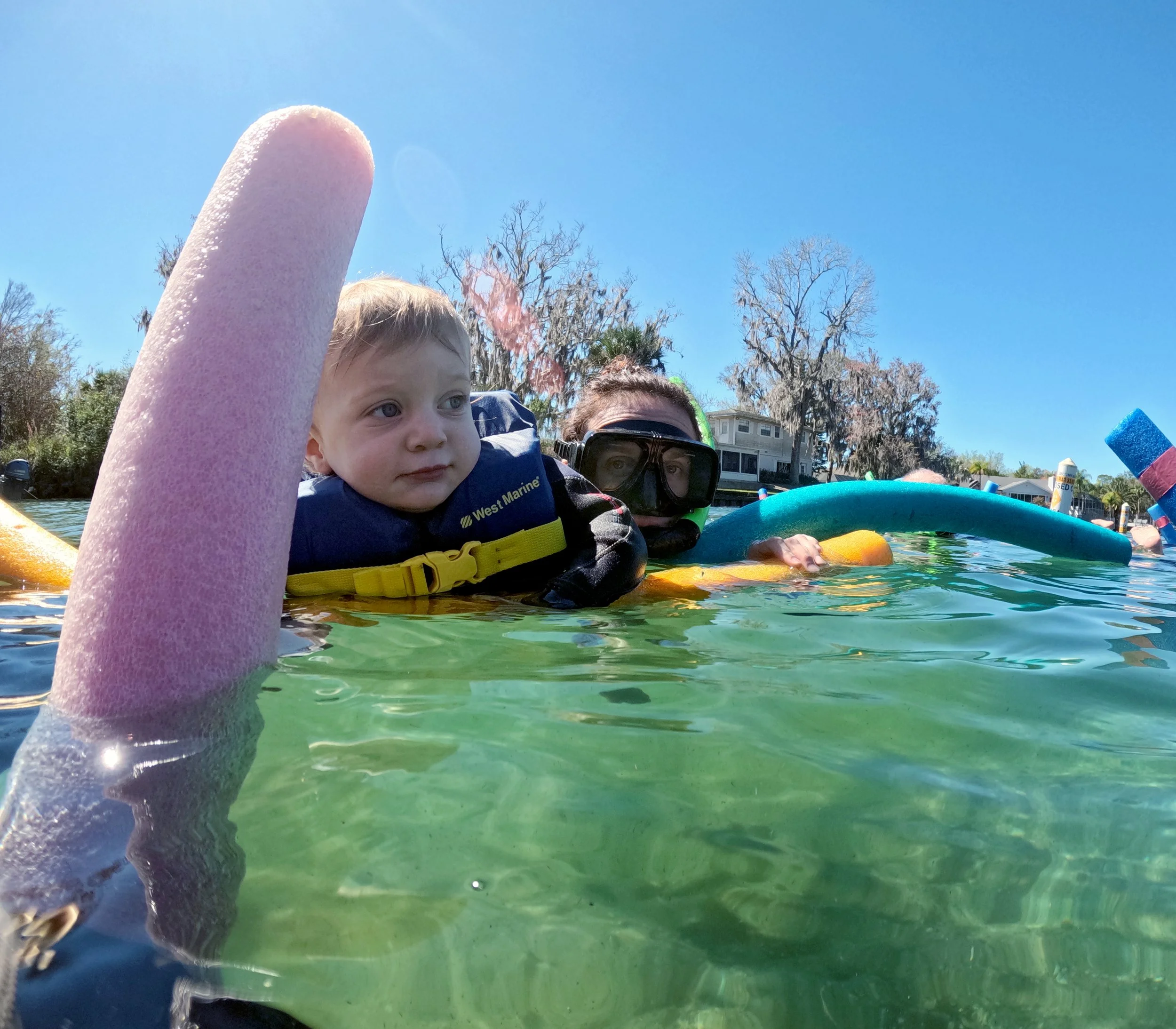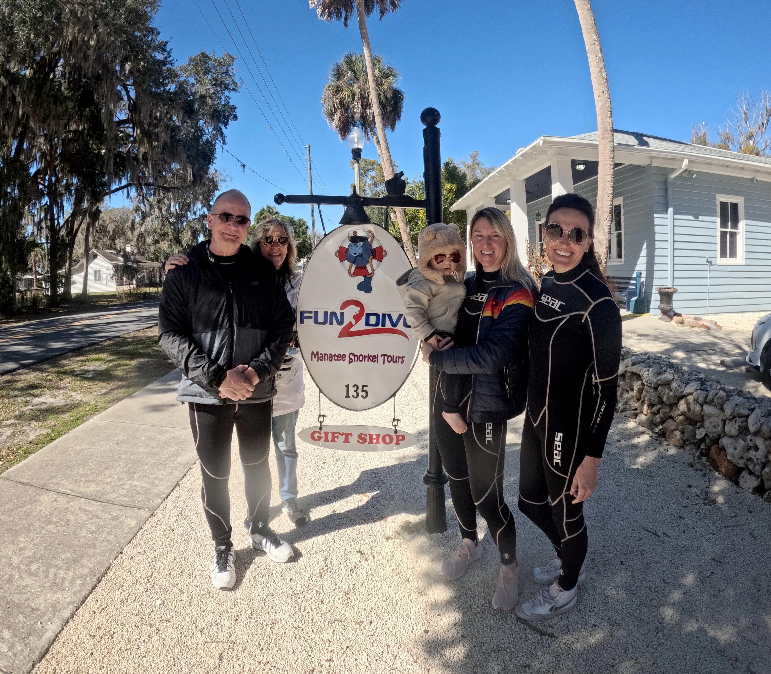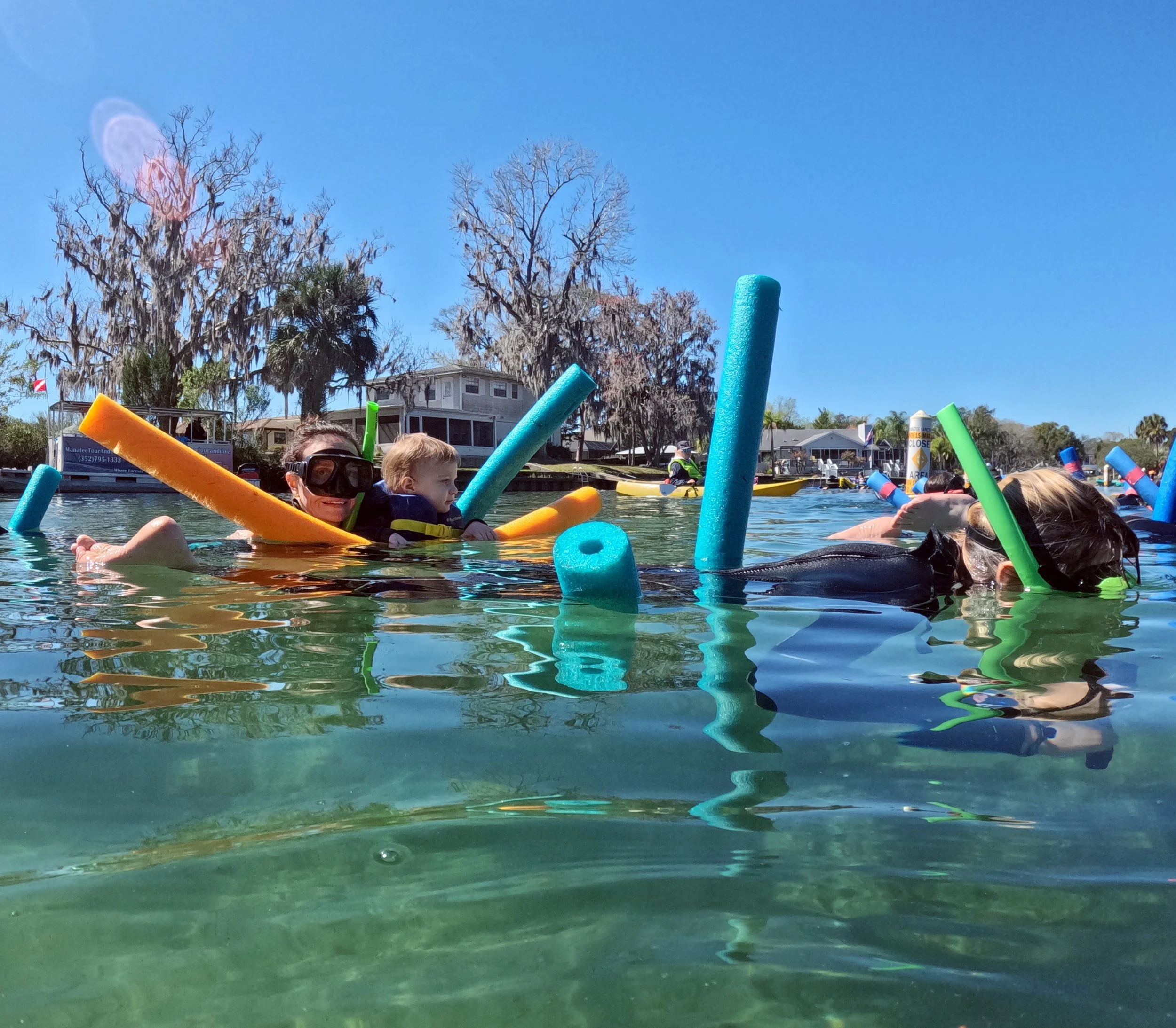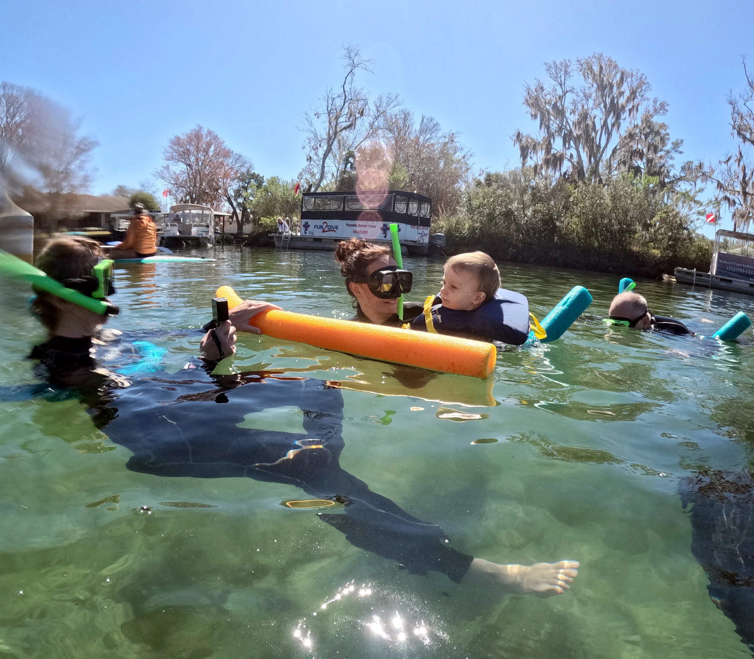 We found a tour company that allows children of any age, and they even had a wetsuit for a 2yr old. While the water was cold and brisk, we wanted Bronte to come into the water for a chance to swim with them. She loved seeing them with her grandma on the boat, and by the time she got into the water, she knew what to look for. I eased her into the water, and she didn’t seem to flinch with the coolness of it. “No, warm water,” was her response. I put a couple foam noodles under her, and glided her to the nearby springs where the manatees were nestled around. She kicked her feet, and paddled along, singing “man-a-tee” the whole way. She got to see grandpa and Jamie in the water, and while she did not look beneath the surface, manatees swam beneath her. It was an incredible experience, one that we were sorry to leave. However leaving became necessary, and once back on the boat, we were all in violent shivers that spilled our hot chocolate from our hands. Bronte, of course, remained un-phased as the rest of us tried to regain warmth in our bodies.