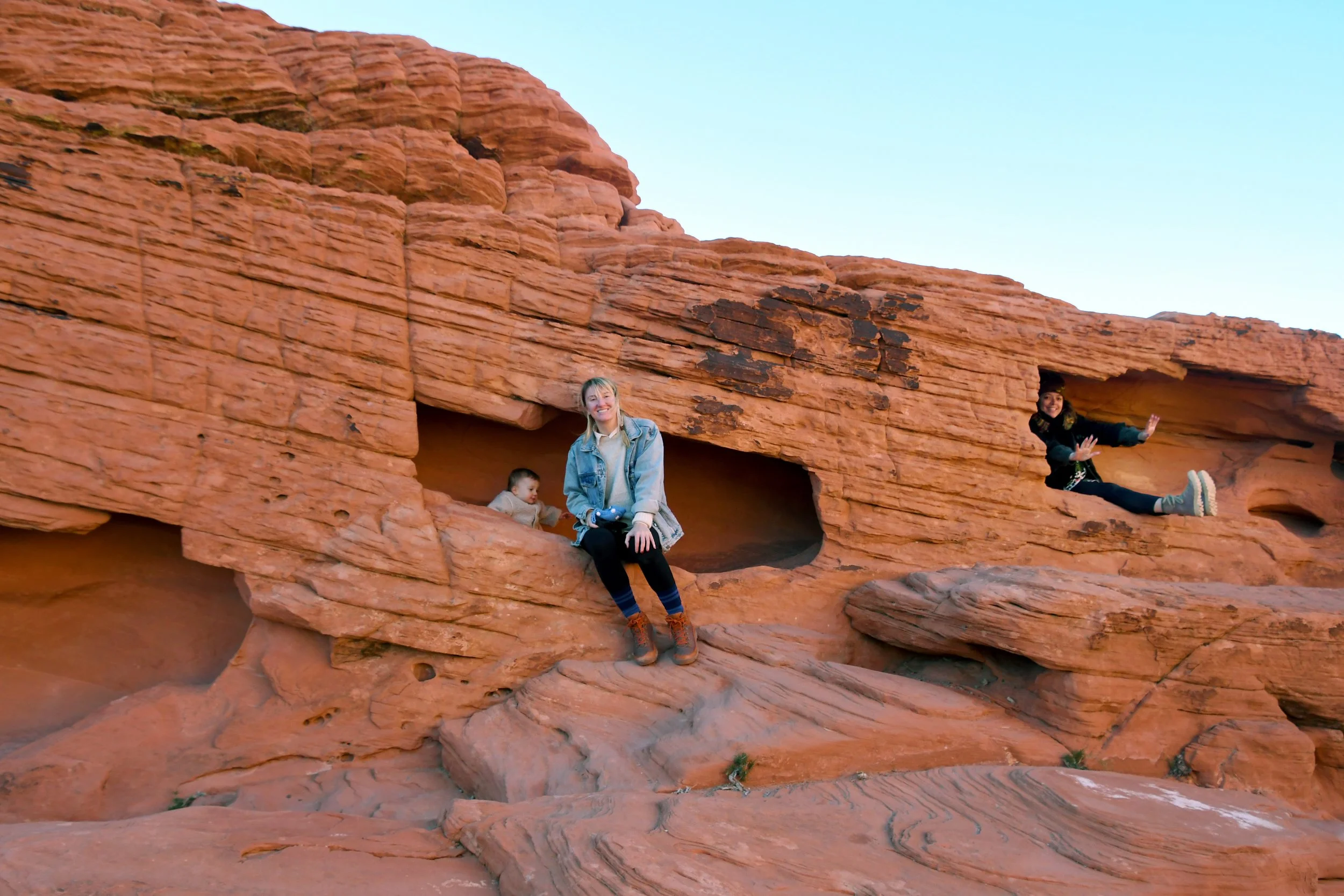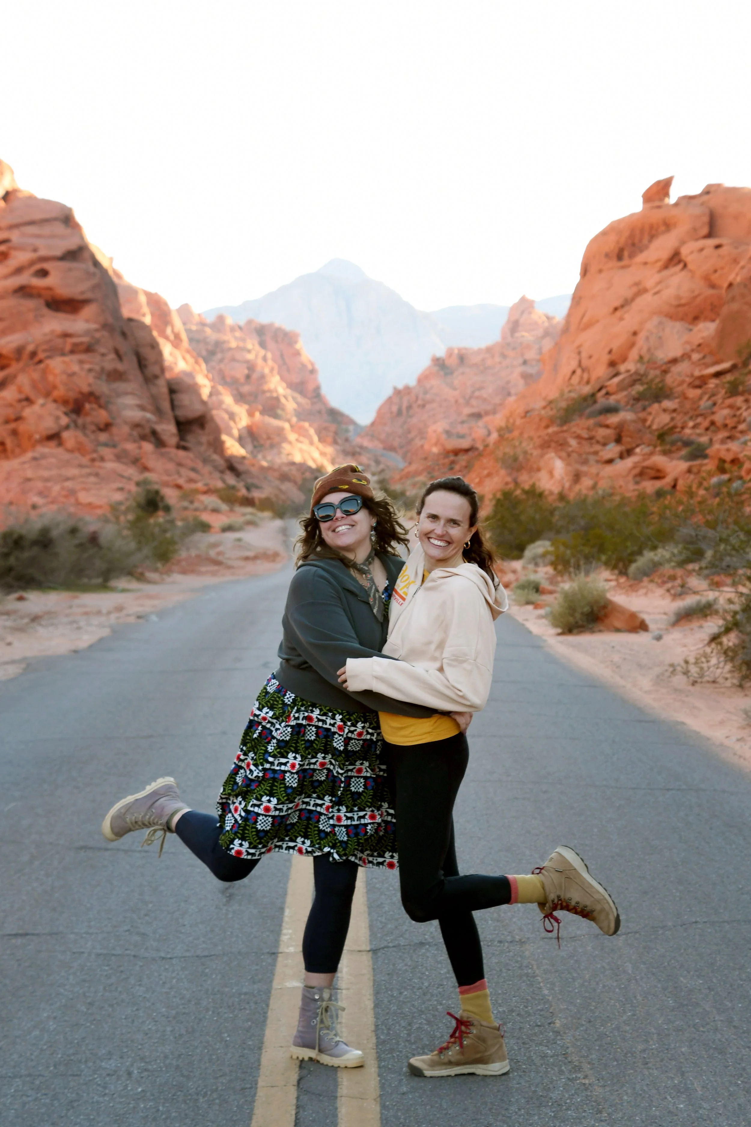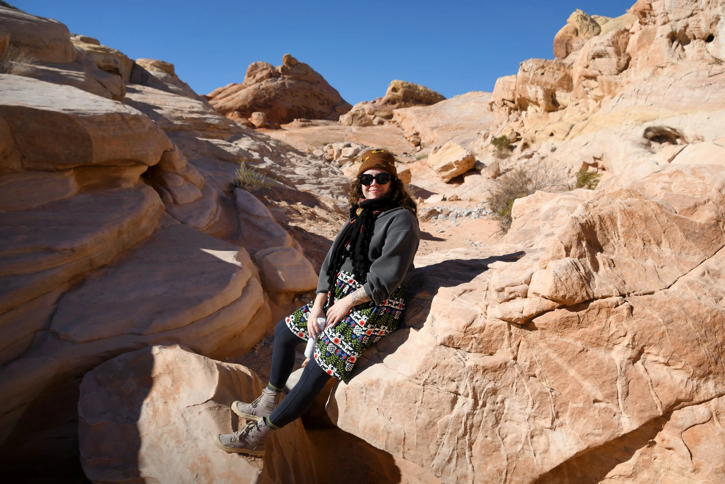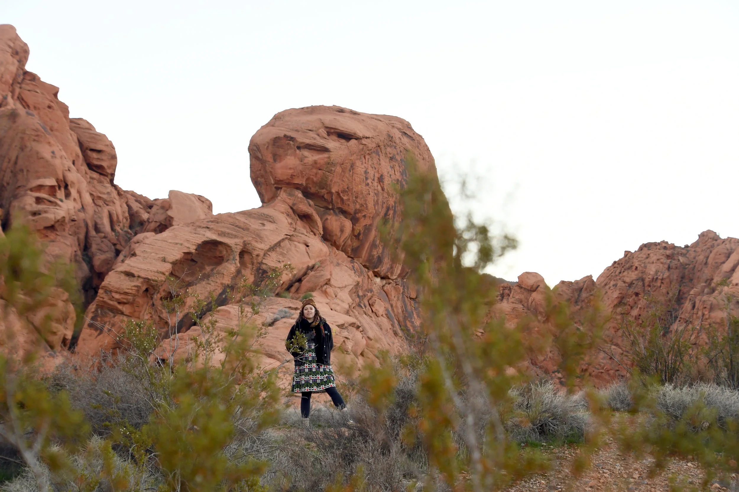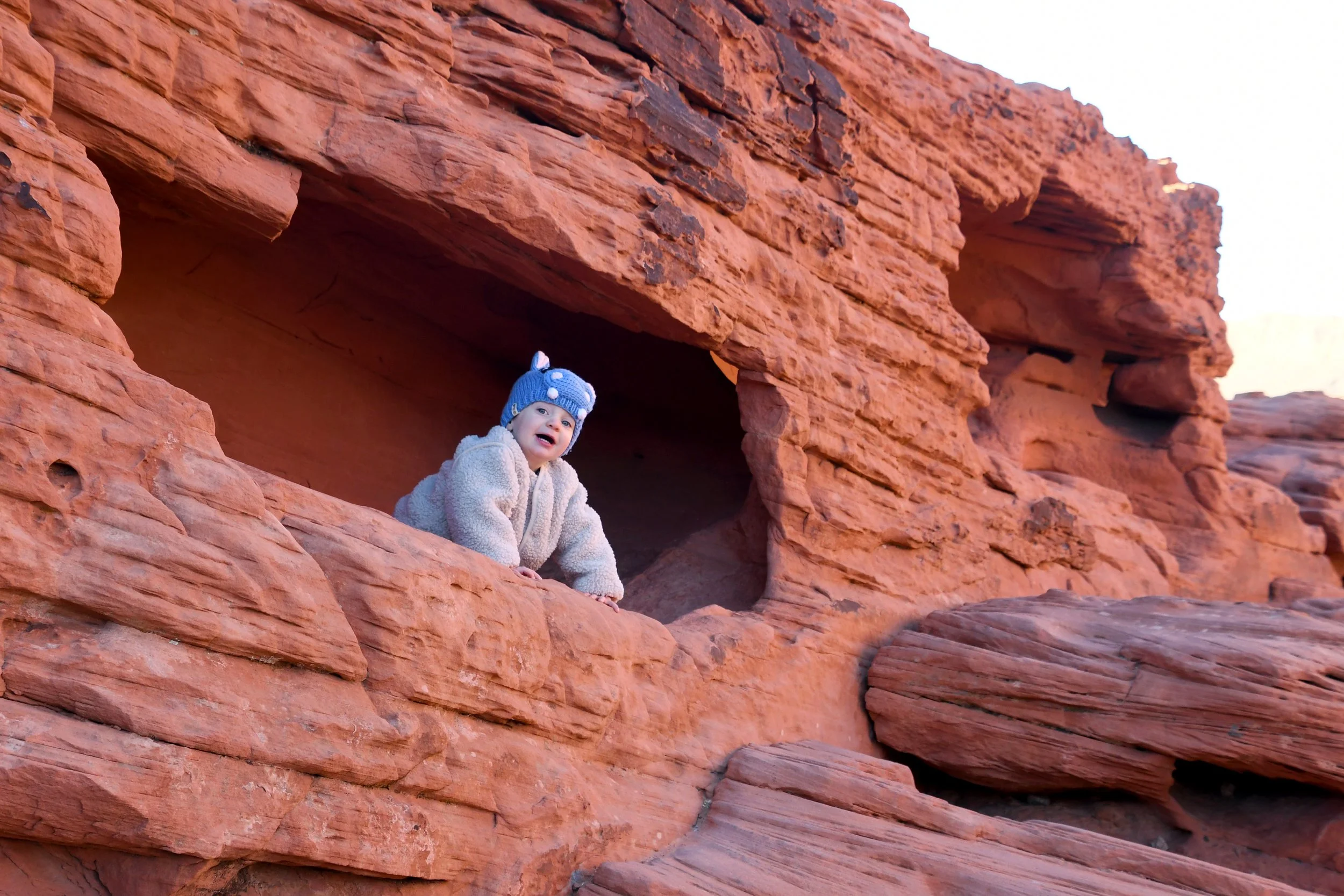 Every January, Megyn comes to California. This year we celebrated her stay with a short visit to The Valley of Fire in the Mojave Desert, and she got another taste of the wild west that lives on repeat in her dreams. We spent two nights at a hotel just by the park entrance, and the mornings drove through the red rocks and winding roads. We stopped at fire waves, pink canyons, and sought out petroglyphs. It was a small park, and we enjoyed the short trails and the many nooks to crawl into and the large rocks to climb upon.